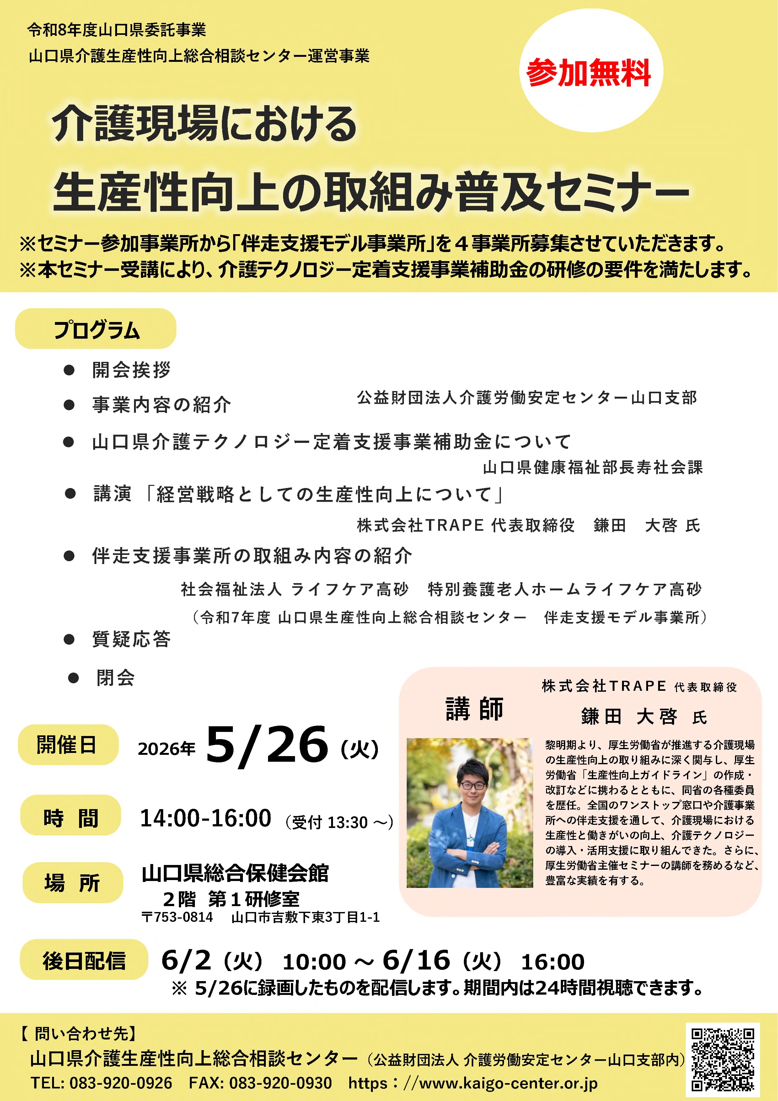 <無料>県委託 ★5月26日(火)介護現場における生産性向上の取組み普及セミナーのご案内★